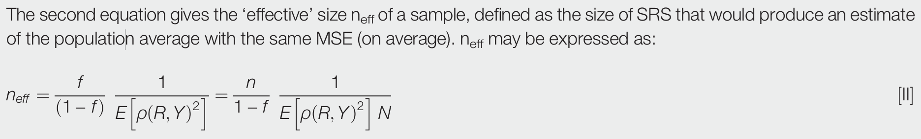 “when \(\rho(R,Y) >0\): larger values of Y are more likely to be in the sample than in the population and vice versa. Where \(\rho(R,Y) =0\), this term cancels the others and there is no [systematic] error”.
