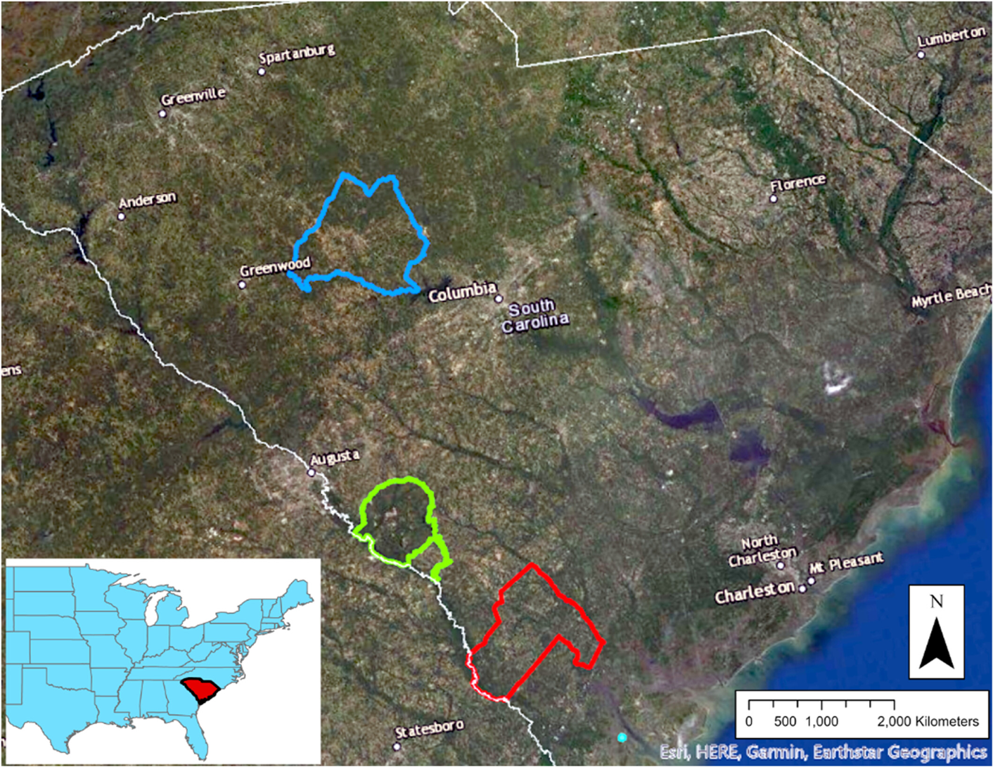 Surveys in 1) The Savannah River Site (green) 2) Newberry County (blue), 3) Hampton County (red)