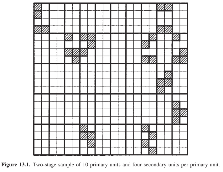 - 1st stage: sample \(n\) primary units (\(N\) = 50; n = 10)
