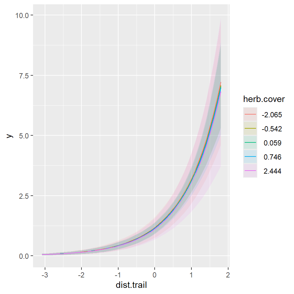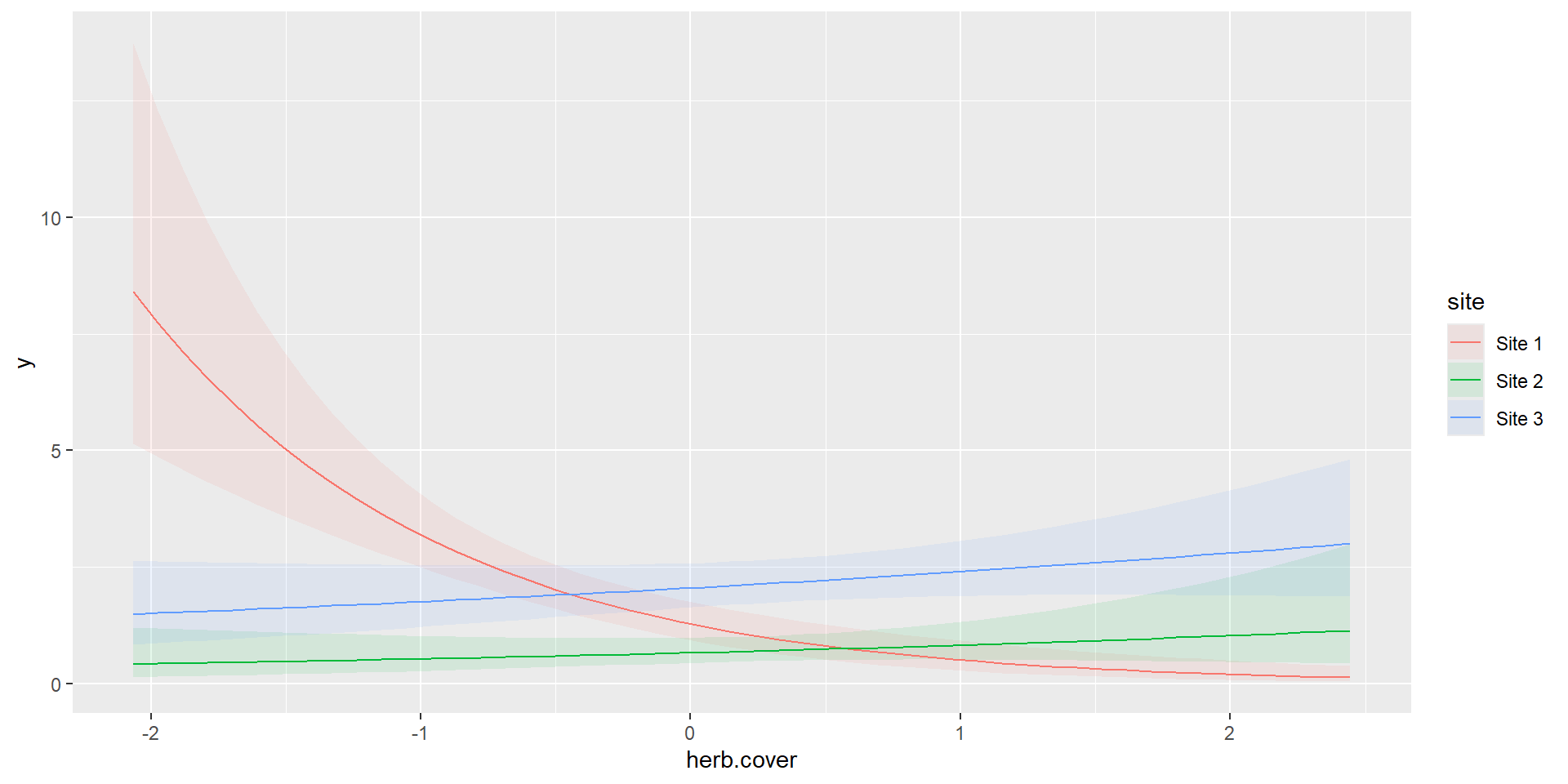 glm(formula = y ~ site + herb.cover + site:herb.cover, family = poisson(link = "log"),