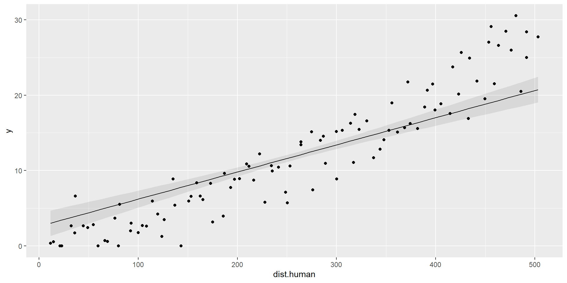 plot1+geom_point(data=dat, aes(x=dist.human,y=y))