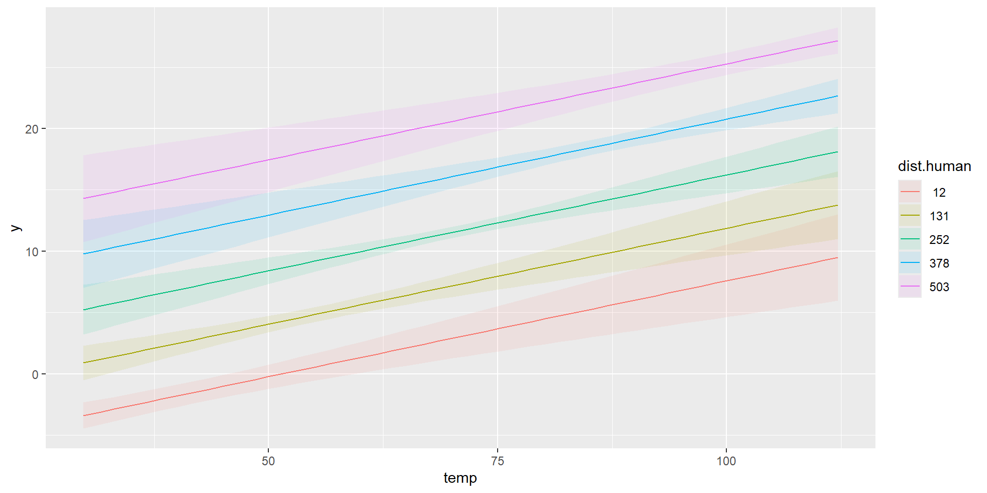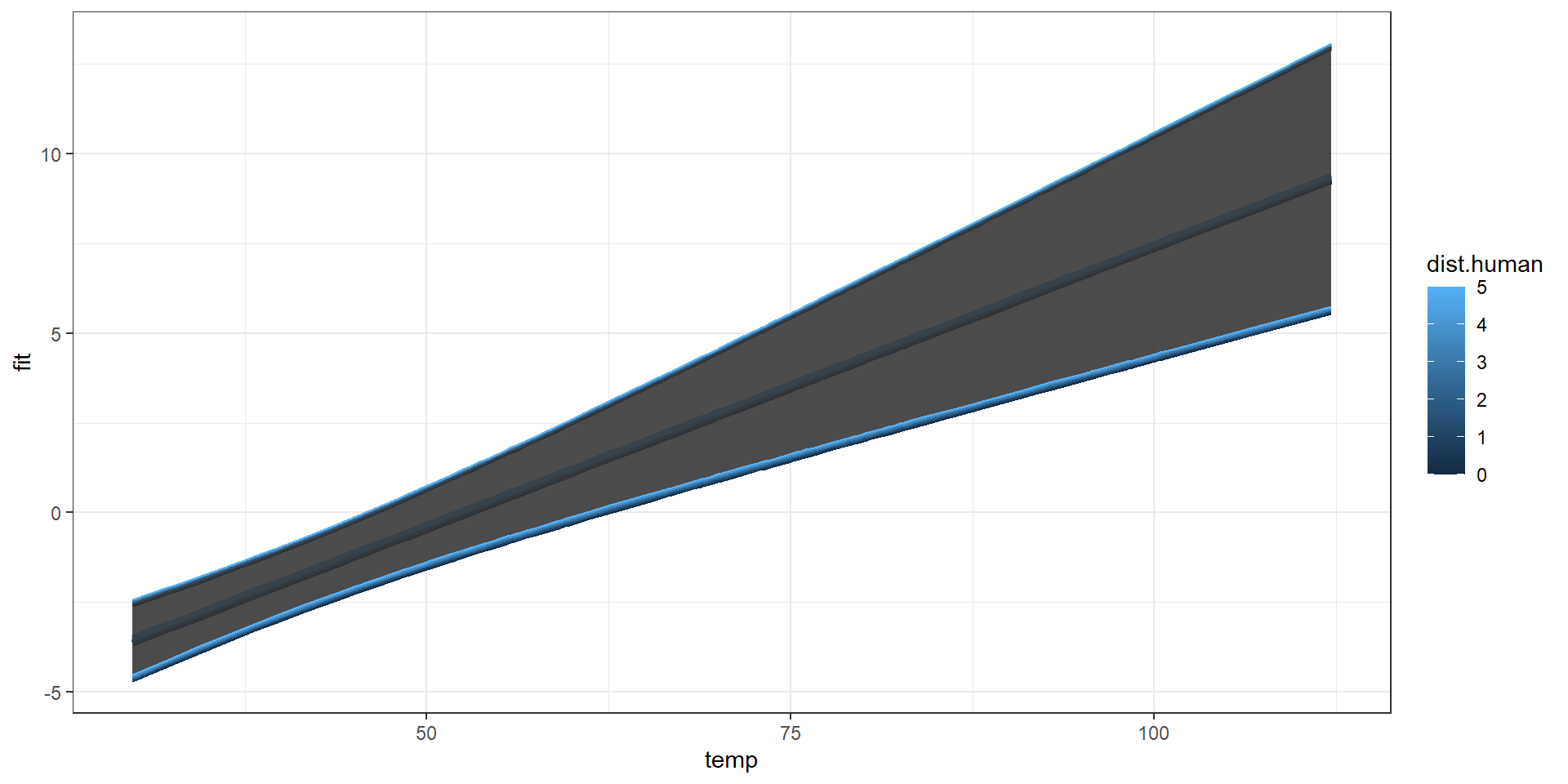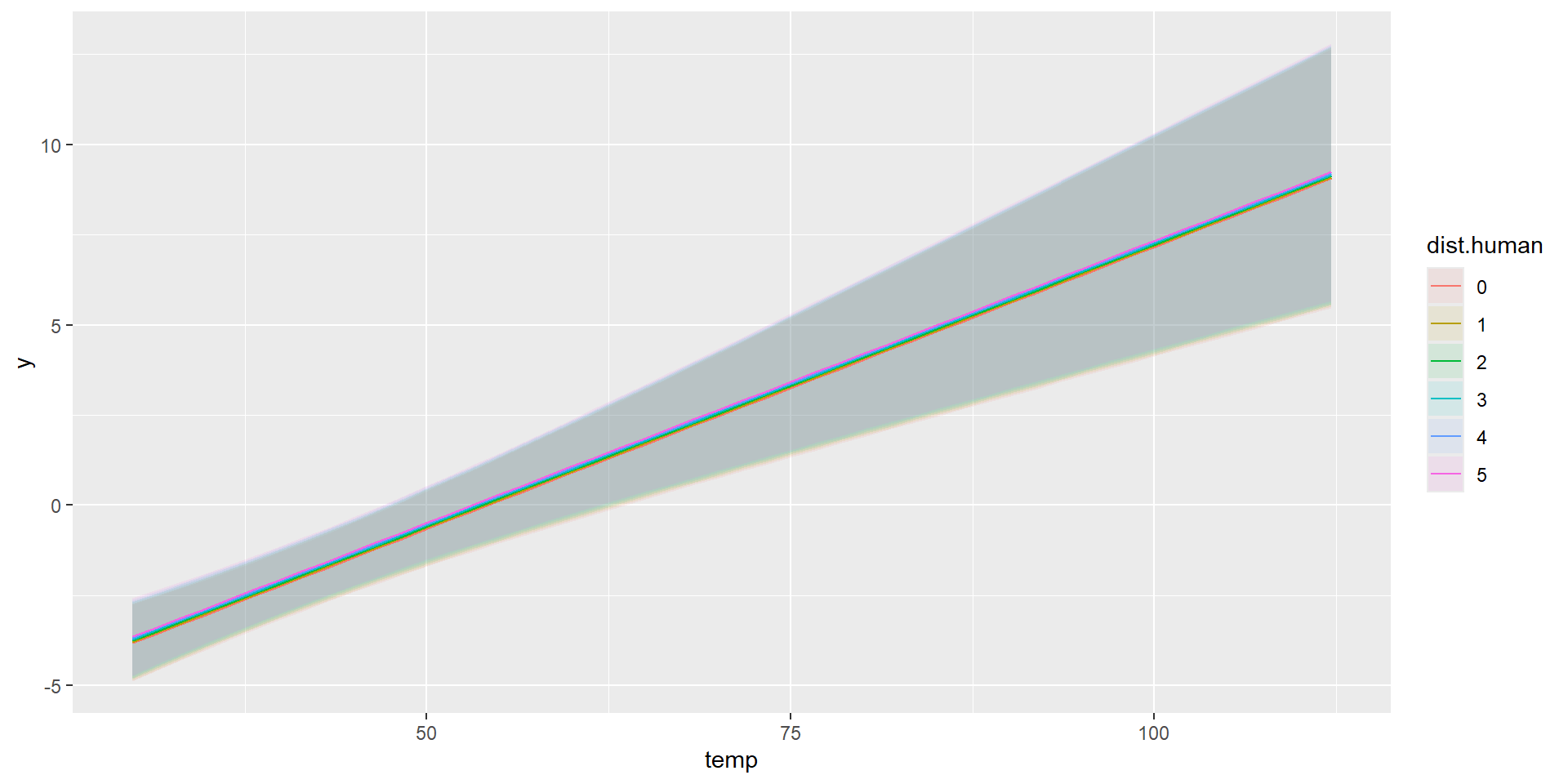 marginaleffects::plot_predictions(model, condition=list("temp","dist.human" = 0:5))