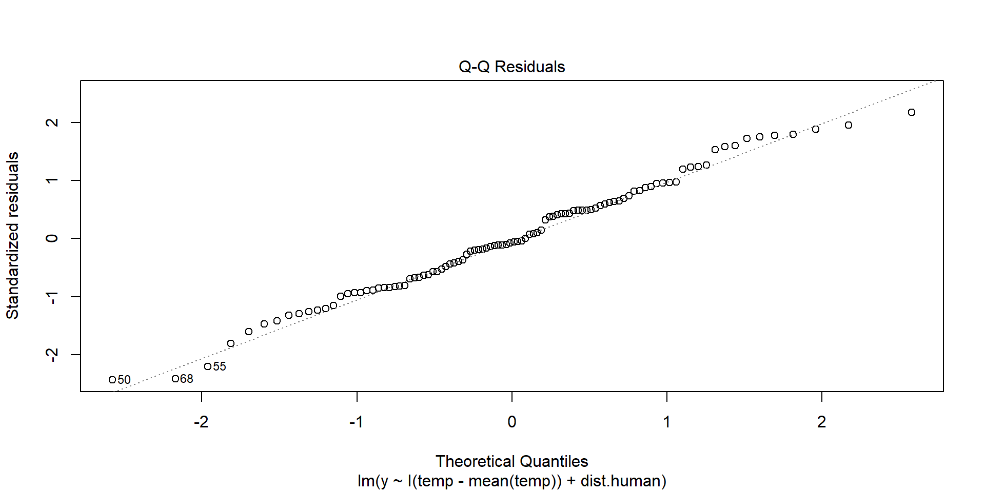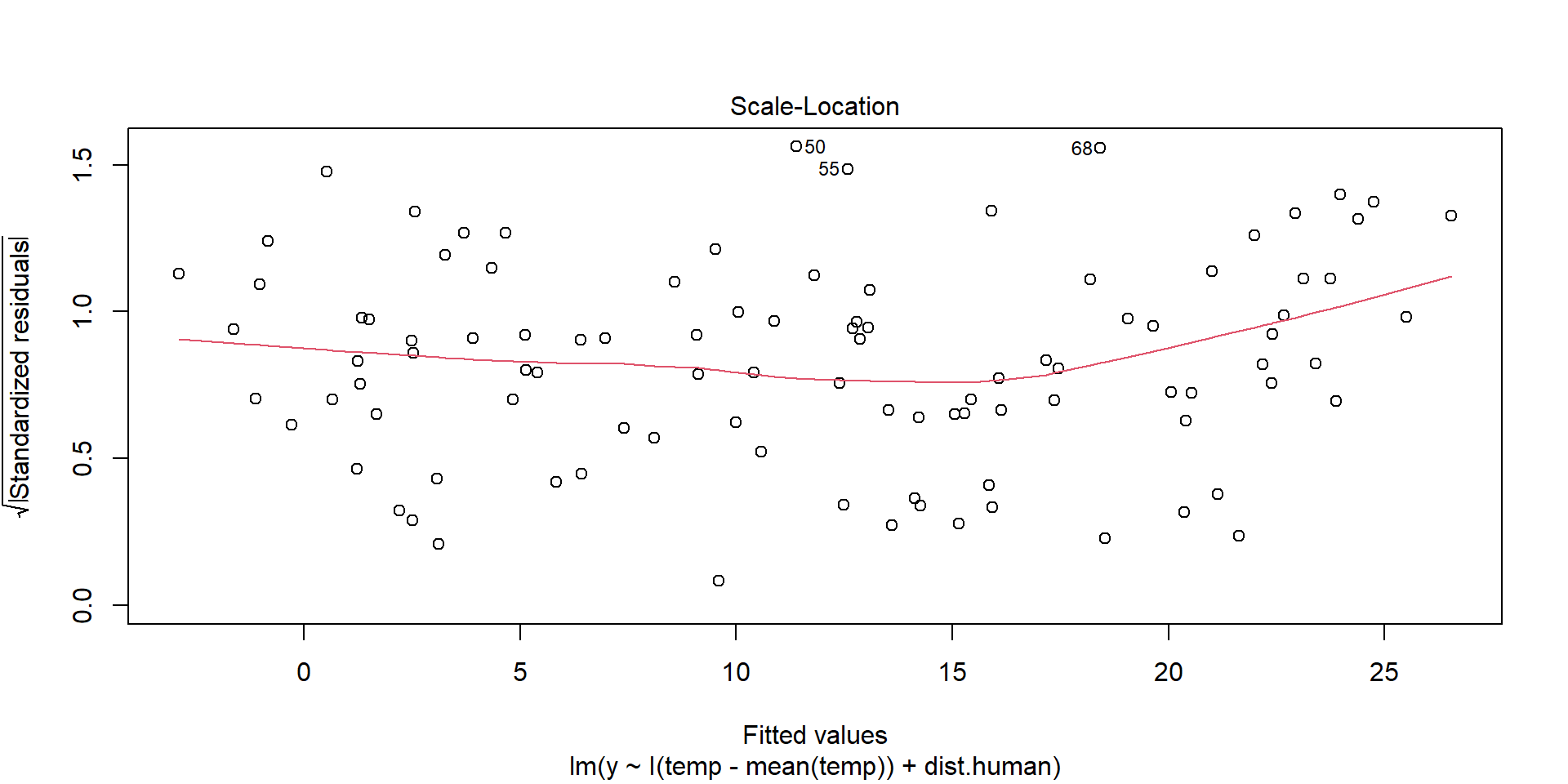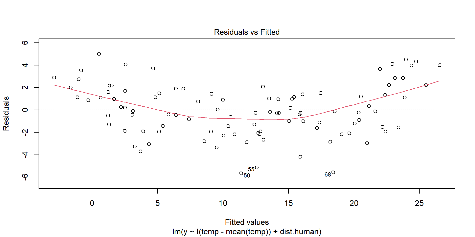 lm(formula = y ~ I(temp - mean(temp)) + dist.human, data = dat)