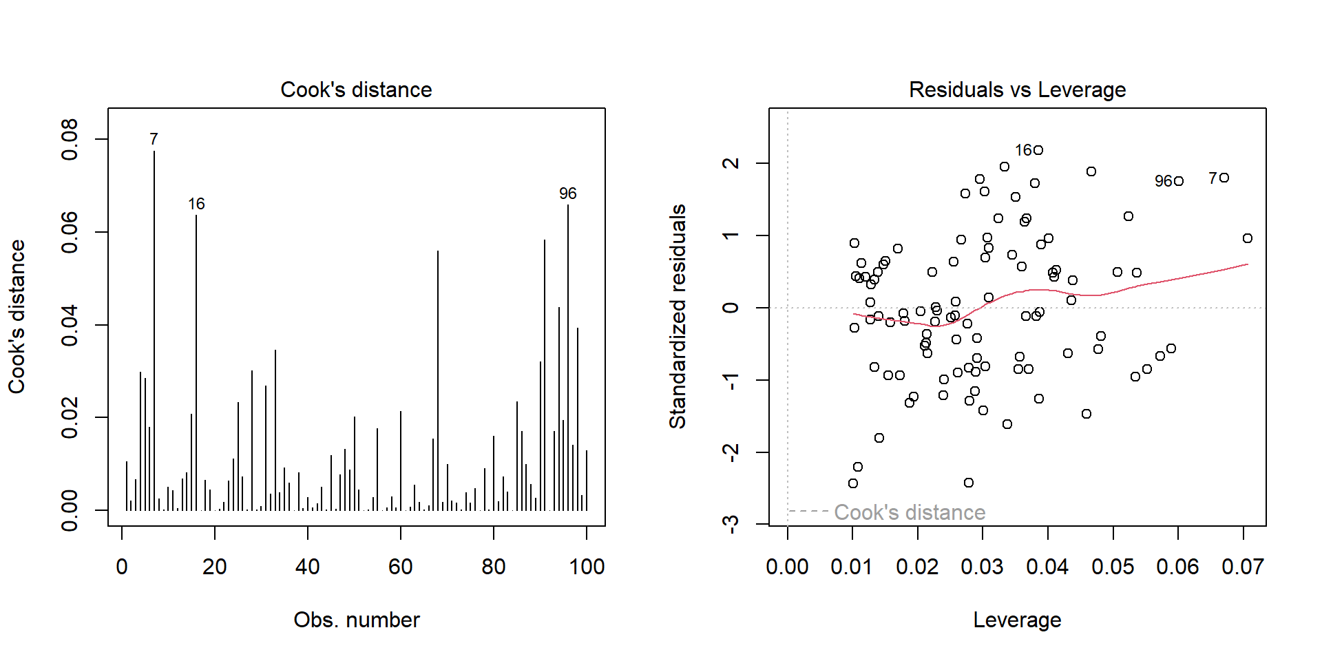 Outlier: extreme value that can affect the \(\beta\) estimate. Leverage plot: points in the upper right and lower right corner.