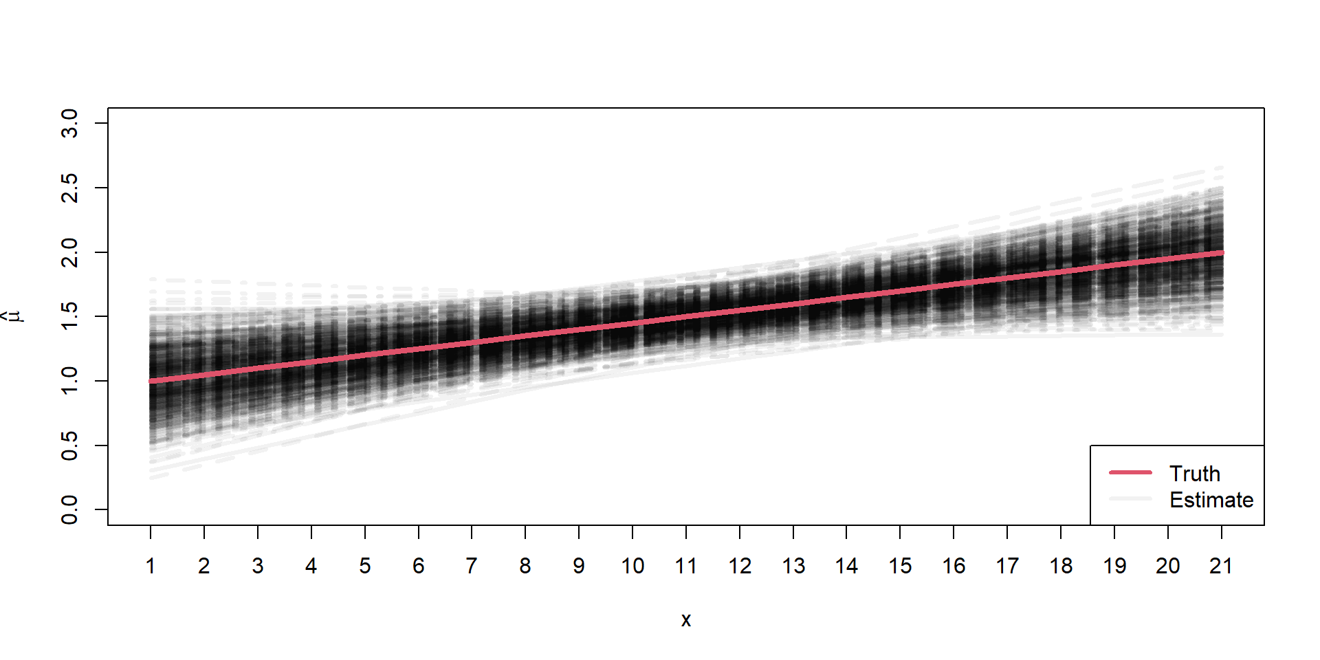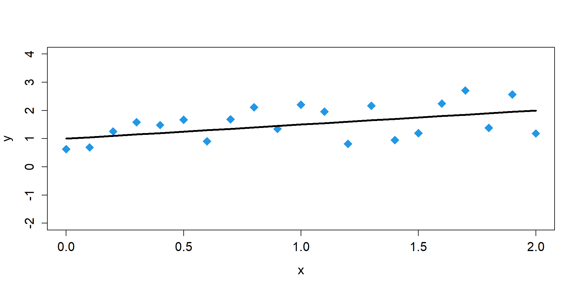 \[ \begin{align*} \mu_{i} = 1 + 0.5 \times x_{i} \end{align*} \]