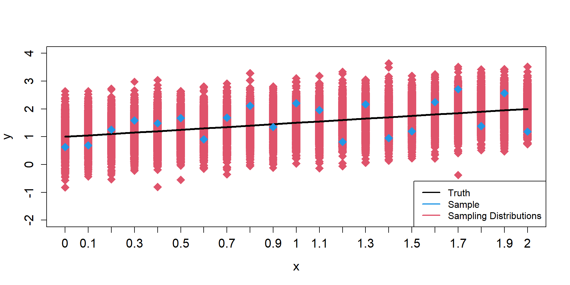 This means that knowing how far observation \(i\) will be from the true regression line tells us nothing about how far observation \(j\) will be from the regression line.