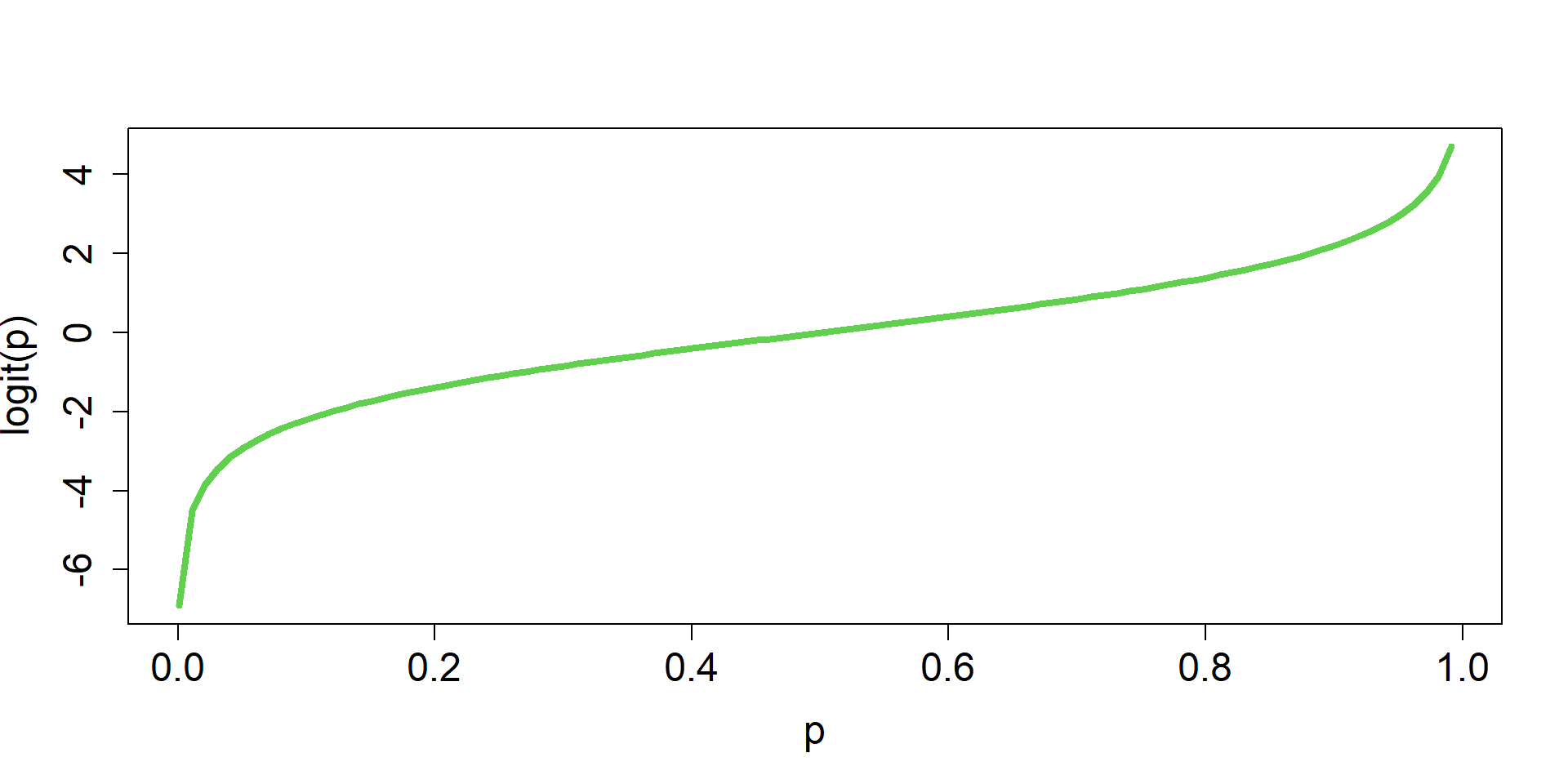 \[ \begin{align*} \text{g}(\boldsymbol{p}) =& \text{logit}(\boldsymbol{p}) = \text{log}(\frac{\boldsymbol{p}}{1-\boldsymbol{p}}) \end{align*} \]