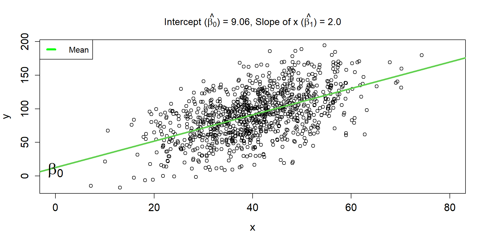 \[ \begin{align*} y_{i} \sim& \text{Normal}(\mu_{i},\sigma) \\ \mu_{i} =& \beta_{0} + \beta_{1}x_{i}\\ \mu_{i} =& 1 + 0.5 \times x_{i} \end{align*} \]