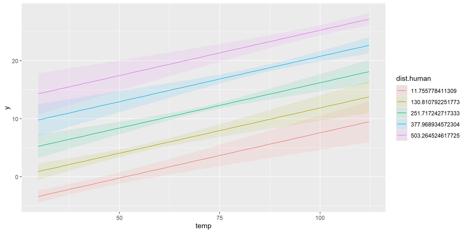 lm(formula = y ~ I(temp - mean(temp)) + dist.human, data = dat)